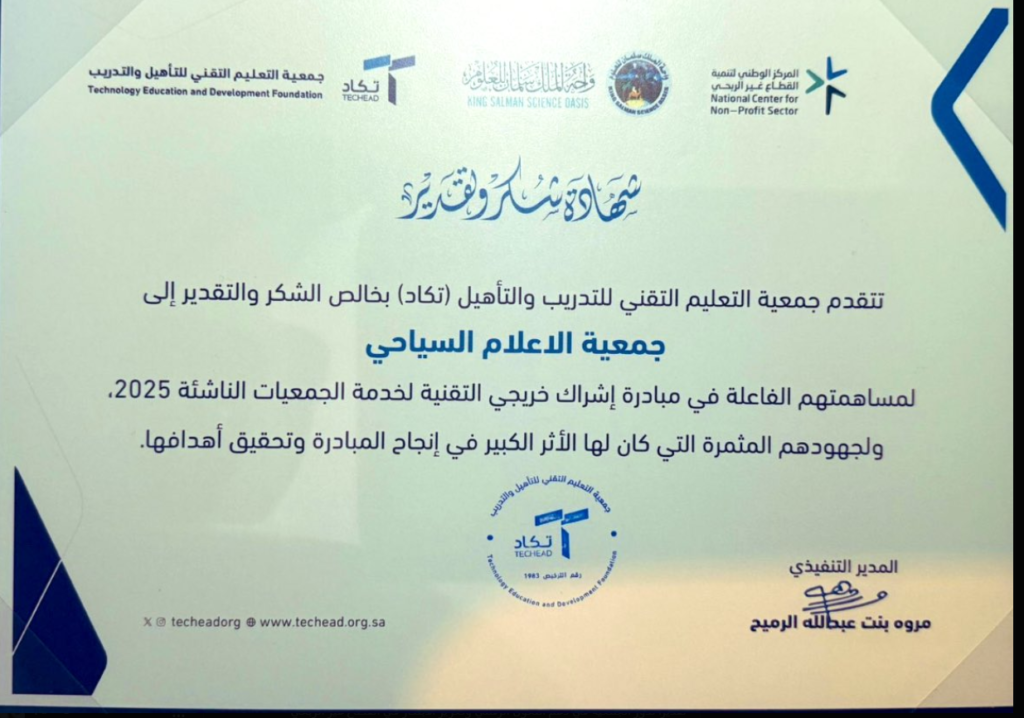 كرّم معالي الدكتور خالد بن عبدالقادر طاهر، المشرف العام على واحة الملك سلمان للعلوم، جمعية الإعلام السياحي نظير مشاركتها في مبادرة “إشراك خريجي التقنية لخدمة الجمعيات الناشئة 2025” ، وذلك بحضور رئيس مجلس إدارة جمعية تكاد الأستاذ مروان الثقفي . وقد استلم التكريم نيابةً عن الجمعية الأستاذ عبدالله الأحمري ،مدير العلاقات العامة، تقديرًا لدور الجمعية في دعم التحول الرقمي وتعزيز الابتكار في القطاع غير الربحي والسياحي.